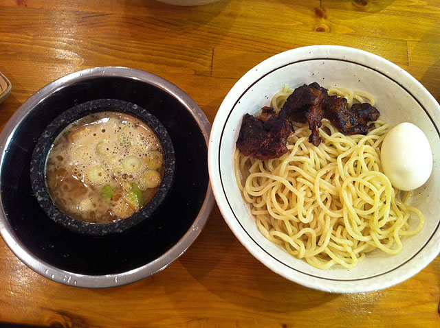 とりあえず定番拉麺は何かなとボタンを見渡して10数秒、どうやらここは「2号店」ではなくつけ麺専門らしく狼狽を隠せませんでした。というわけで頭の整理のできぬままつけ麺並¥790+特製チャーシュー¥270+ダシ注入玉子濃口¥130の券を購入。おいおい一体いくらになるんだ